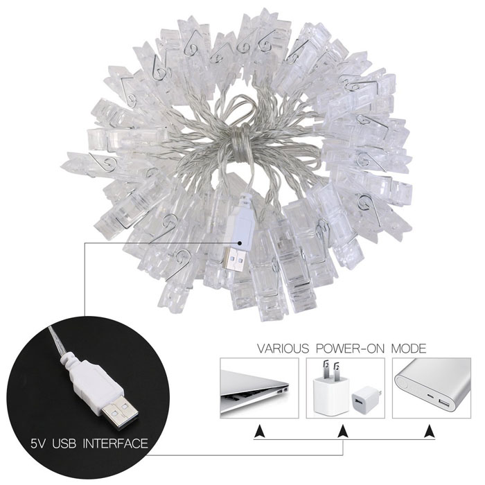 30 Clear Photo-Clips, total length 13.5FT(4.5m), clips are spaced 3.15in(15cm) apart, enough space for most artworks and photos, and each clip contains a LED light, you can diy unique decorations with it.